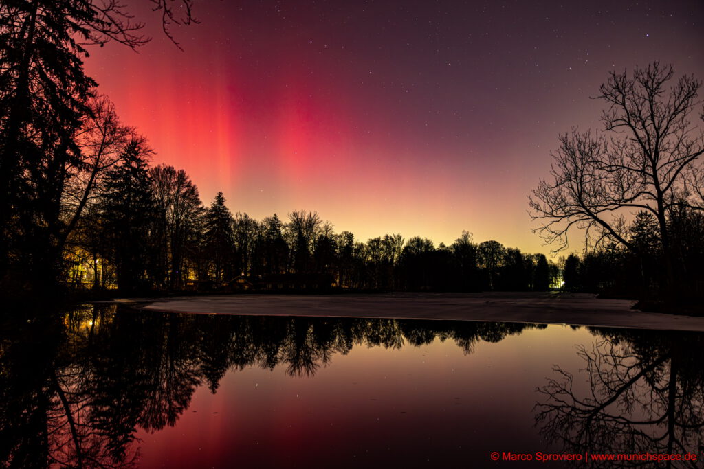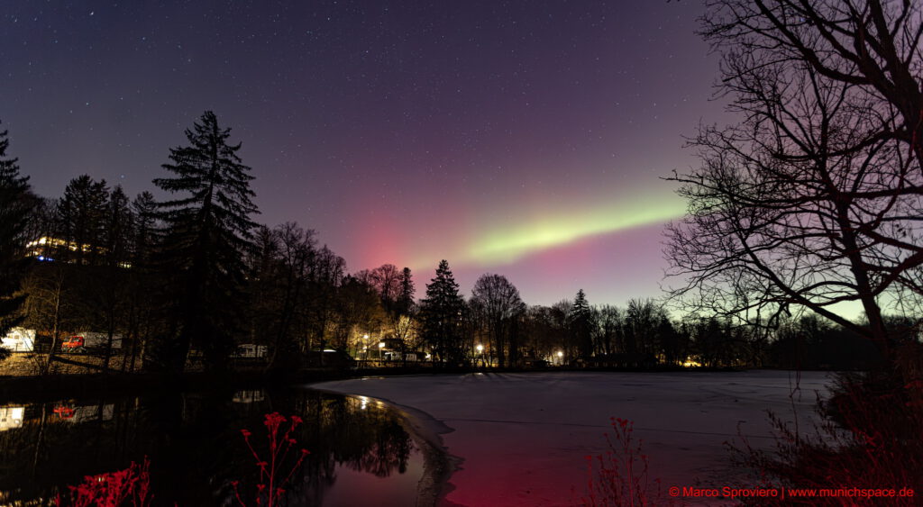 Wir bewunderten das beeindruckende Himmelsschauspiel über dem Hinterbrühler See im Süden Münchens. Sowohl das rote Schimmern als auch die immer wiederkehrenden türkis/grünlichen Lichter waren mit dem bloßen Auge zu sehen.